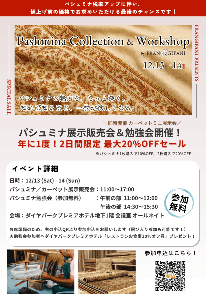 最も喜ばれるギフトアイテムのパシュミナストールについて、深堀りするイベントです。GST見直しで税率が大幅にアップしましたため、値上げ前価格&セール価格でお求めになれるラストチャンス、是非ご利用ください