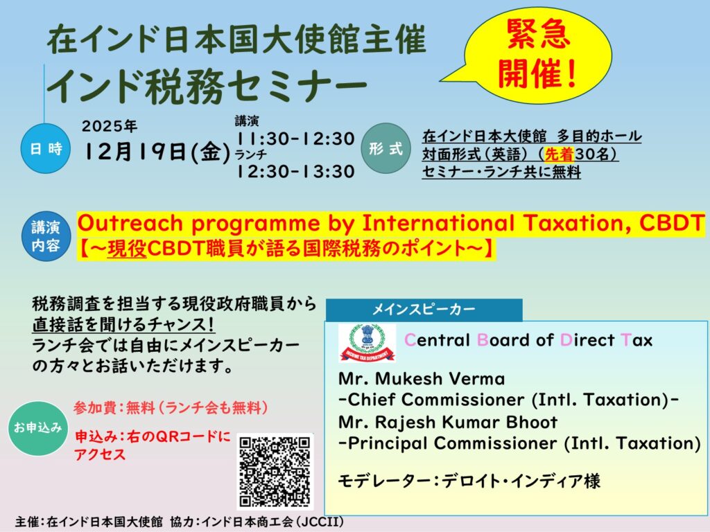 在インド日本国大使館主催:「インド税務セミナー開催のお知らせ」