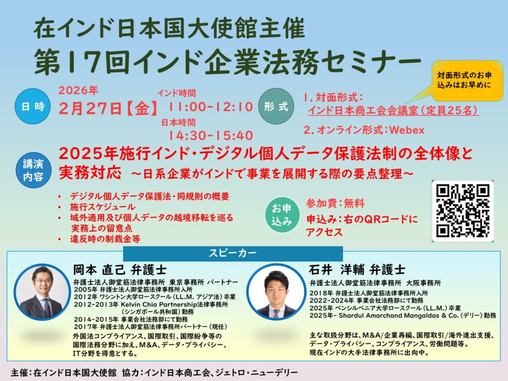 在インド日本国大使館主催:「第17回インド企業法務セミナー開催のお知らせ」