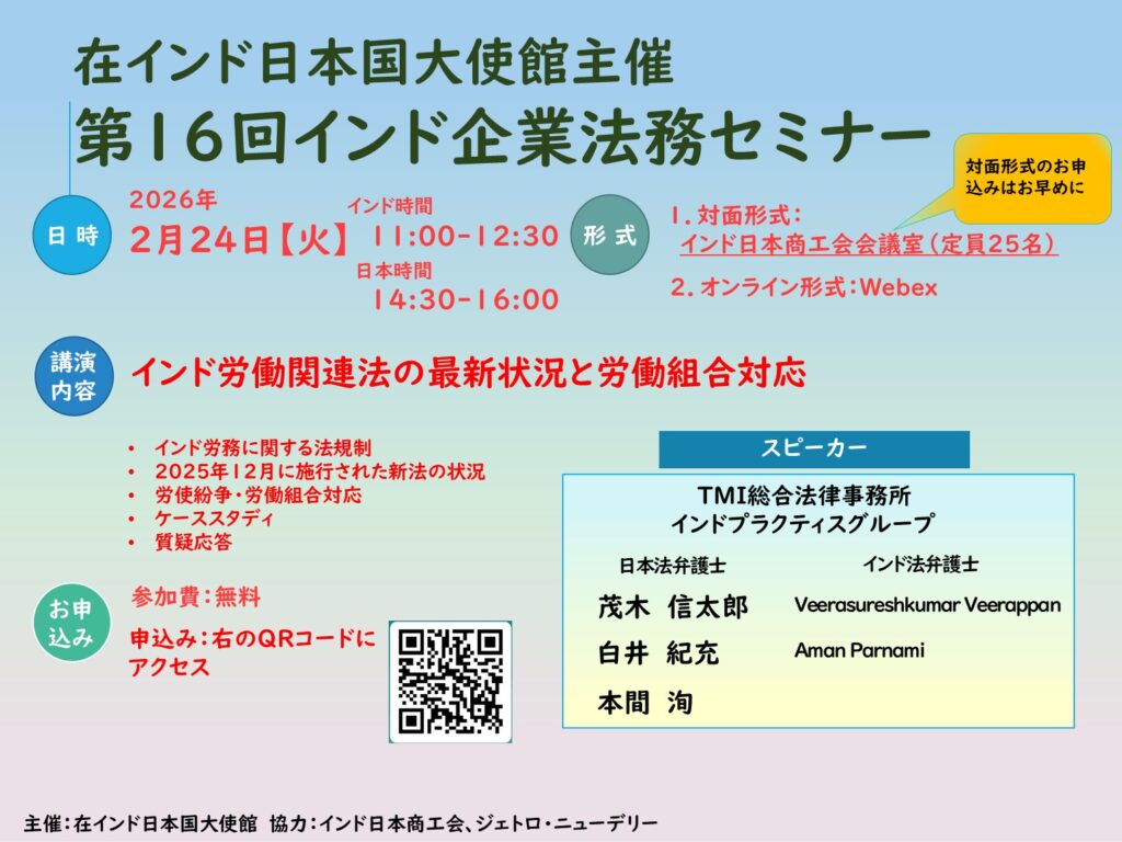 在インド日本国大使館主催:「第16回インド企業法務セミナー開催のお知らせ」